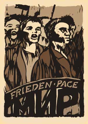 | Diese Postkarte nimmt die Tradition auf, zum Maifeiertag eine Friedenskarte zu versenden. Die als Holzschnitt hergestellte Künstlerkarte bekräftigt durch ihr Motiv, dass Frieden energisch eingefordert werden muss.