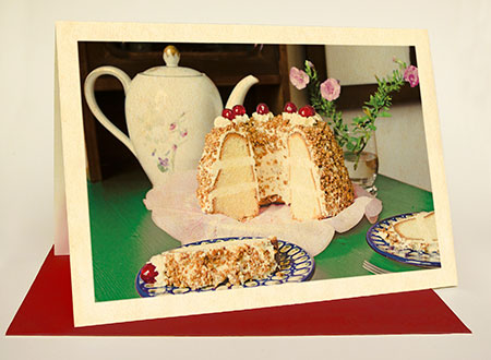 Die beliebte Postkarte vom Frankfurter Kranz als feierliche Klappkarte. Zur Auswahl stehen ein kirschrotes oder buttergelbes geripptes und gefüttertes Kuvert.