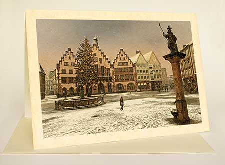 Den Weihnachtsbaum auf dem Römerberg als feierliche Klappkarte im roten gerippten und gefütterten oder cremefarbenen Kuvert.