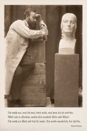 | Diese Postkarte zeigt Daniel Greiner mit einer weiblicher Büste im Jahre 1905. Sie ist eine Variation zum Thema "Frau Sorge". Unter dem Bild ein Gedicht Greiners: "Ich weiß nur, was ich war, doch nicht, was heut ich sei und bin. Wird mir je offenbar, wohin sich wandelt Sein und Sinn? Ich weiß nur Eins und das ist wahr: Ich werde wandelnd, der ich bin."  |
