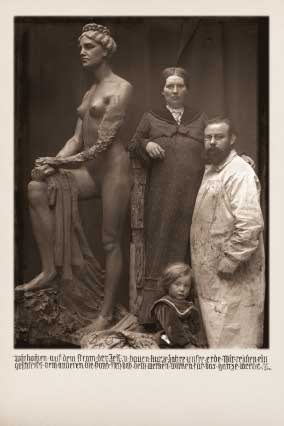 | Auf dieser Postkarte ist Daniel Greiner mit seiner Ehefrau Emilie und seinem Sohn Baldur neben einer überlebensgroßen weiblichen Tonfigur im Arbeitszustand im Jahre 1906 zu sehen.  Darunter ein Spruchband, welcher noch heute am Wohnhaus des Künstlers zu lesen ist: "Wir kommen auf dem Strom der Zeit und bauen kurze Jahre unsre Erde. Wir reichen ein Geschlecht dem anderen die Hand. Sieh daß dein Werken Wirken für das Ganze werde. 20.5.1928"  |