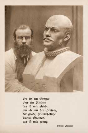 | Diese Postkarte zeigt Daniel Greiner im Jahre 1904 mit der Porträtbüste des Landgrafen von Hessen, Philipp der Großmütige, *13. November 1504. Die Büste ist ein Auftrag zum 400. Geburtstag des Landgrafen. Unter dem Foto ein Gedicht Greiners: "Ob ich ein Großer oder ein Kleiner, das ist mir gleich, bin ich nur der Greiner, der grade, grundehrliche Daniel Greiner, das ist mir genug."  |