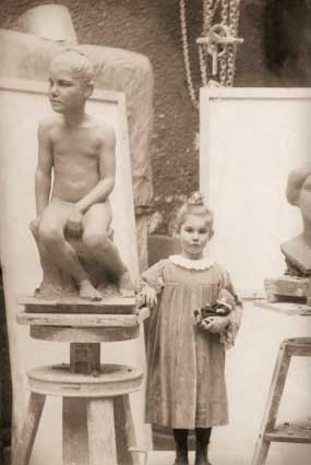 | Eine Postkarte mit Waltraut, der ältesten Tochter von Daniel Greiner im Jahre 1906 neben einem sitzenden Mädchenakt im Arbeitszustand (Tonmodell). | |