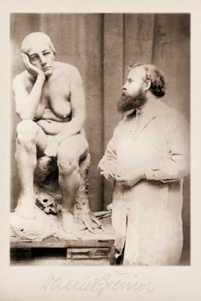 | Daniel Greiner im Jahre 1905 mit sitzendem Frauenakt "Frau Sorge" im Arbeitszustand (Tonmodell). Auf dieser Postkarte ist auch Greiners Unterschrift verewigt.  |