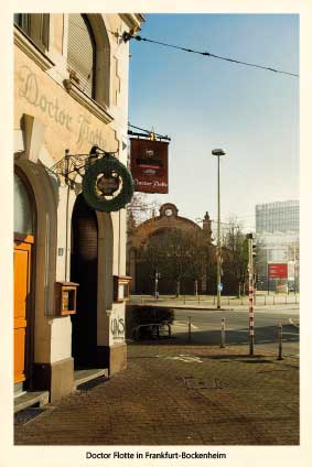 | "Doctor Flotte" ist eines der letzten Bierlokale in Frankfurt. Stammgäste, die schon zum Inventar gehören, Studenten, Banker - eine offene, bunte Mischung von Gästen in der stets verrauchten Kneipe. Eine Dartscheibe, ein Spielautomat und jedes Eintrachtspiel im nie veränderten Gastraum. Kneipenkultur, die erst schließt, wenn die letzten gegangen sind.  |