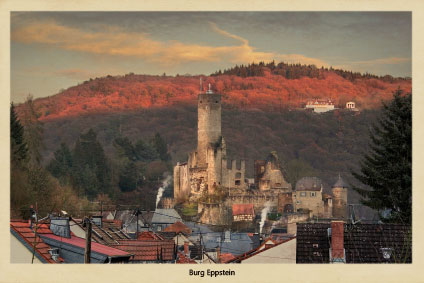 | Eppstein wird auch die "Perle der Nassauischen Schweiz" genannt. Auf einem schmalen Felsrücken erhebt sich die Burg über der Altstadt, die tief im