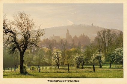 | Streuobstwiesen gehören in Kronberg zum traditionellen Landschaftsbild. Einst umgab die Stadt ein breiter Gürtel von Baumgrundstücken. Nur wenige Streuobstwiesen gibt es heute noch in der Stadt, die früher hauptsächlich vom Obstanbau lebte. Mittlerweile werden Streuobstwiesen wieder geschätzt, bestehende Wiesen gepflegt und alte Apfel- und Birnensorten nachgepflanzt. |